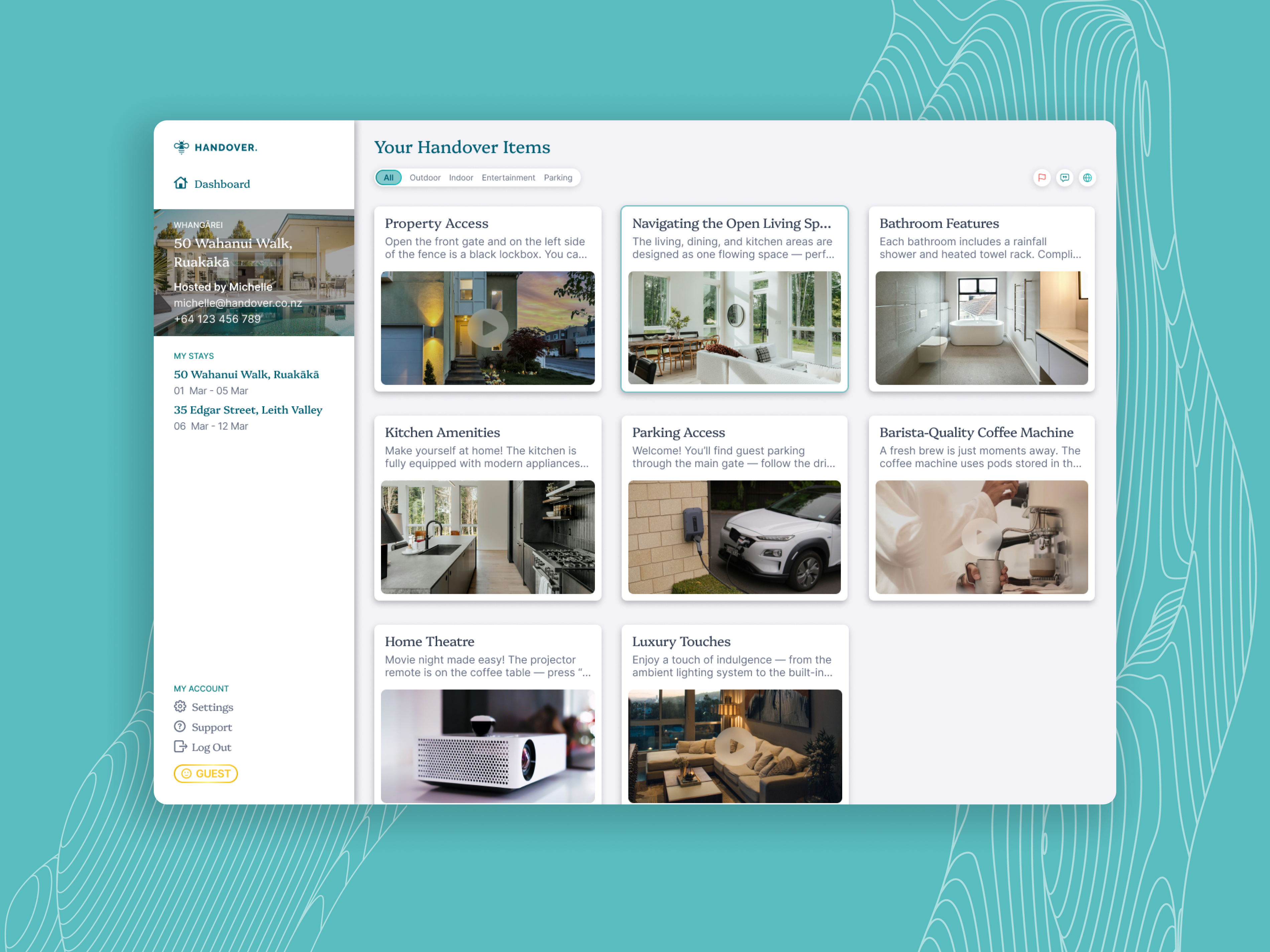 Considering the experience of the core user (a guest arriving to a rental property), I focussed heavily on the mobile experience first, to ensure that every interaction felt great in-hand, before expanding it out to a robust desktop view.